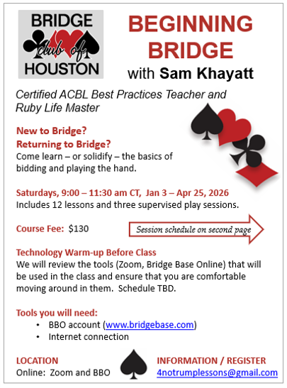 ♣️ In 2021 Sam pioneered Houston's first online bridge course for Beginning Bridge players. That Saturday morning class continues to be a popular offering for many who are still working!